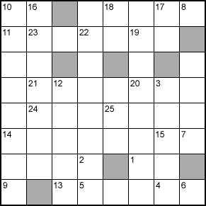 The 6-letter word in each box is an anagram to the answer to each of the clues below.... almost. You see, in this puzzle, all of the answers are five letters long, so remove an extra letter from each 6-letter word to get each answer. Put the number of each corresponding clue into the small box below the initial word and write down the anagram on the dash directly below that. The numbers in each row and column will add up to 65.